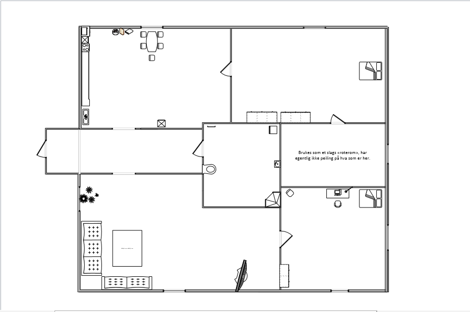 På bildet under ser du en plantegning av hjemmet mitt. Visio var litt komplisert for meg fordi jeg misforsto størrelser og diverse. Og det ble uheldigvis for sent og rette opp i. Men her kan man i alle fall se en tegning som viser tilsammen 7 rom.